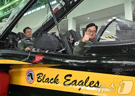 (서울=뉴스1) 국회사진기자단 = 우원식 국회의장이 14일 강원도 원주시 제8전투비행단을 위문 방문, 특수비행팀 블랙이글스의 T-50B에 탑승해 포즈를 취하고 있다. 2026.1.14/뉴스1pizza@news1.krCopyright ⓒ 뉴스1. All rights reserved. 무단 전재 및 재배포, AI학습 이용 금지.