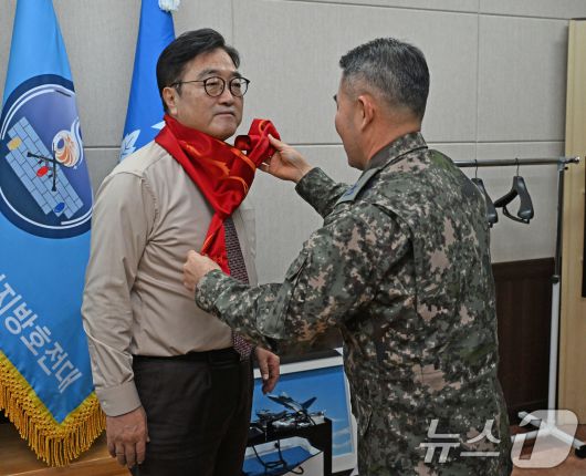 (서울=뉴스1) 국회사진기자단 = 우원식 국회의장이 14일 강원도 원주시 제8전투비행단을 위문 방문해 빨간 머플러를 메고 있다. 2026.1.14/뉴스1pizza@news1.krCopyright ⓒ 뉴스1. All rights reserved. 무단 전재 및 재배포, AI학습 이용 금지.