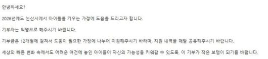 [논산=뉴시스]논산시에 2억7300만원을 기탁한 익명의 기부천사가 남긴 이메일 내용. 2026. 01. 14 photo@newsis.com *재판매 및 DB 금지 |