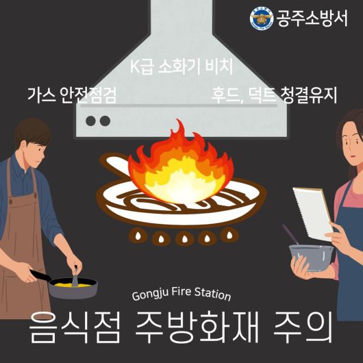 충남 공주소방서는 겨울철 화재 발생 위험이 높아지는 시기를 맞아 음식점 주방에서 발생하는 후드·덕트·벽체 기름때 화재에 대한 각별한 주의를 당부했다.