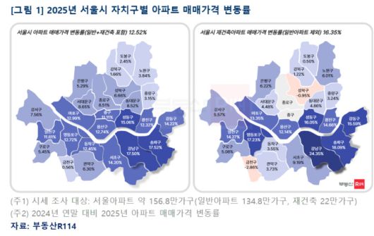 14일 부동산R114에 따르면 2024년 말 대비 2025년 서울 아파트 매매가격은 12.52% 상승했다. 특히 재건축 단지가 16.35% 오르며 전체 시장 상승을 견인했다.