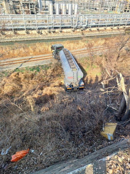 탱크로리 차량은 충격 여파로 도로 아래 철길로 추락했고 운전자는 자력으로 탈출했다.