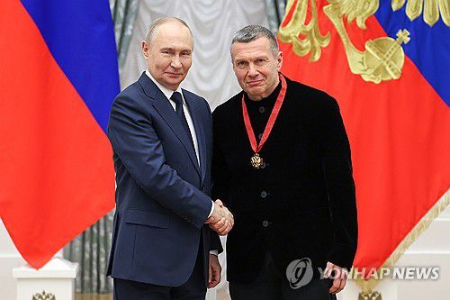 블라디미르 푸틴 러시아 대통령과 악수하는 솔로비요프(오른쪽) |