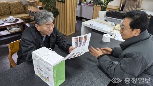 황간면 지역사회보장협의체가 지난 한 해 동안 나눔을 실천한 지역의 한 후원자에게 지역 소식지인 ‘황사모의 사랑이야기’를 전달하고 있다. |
