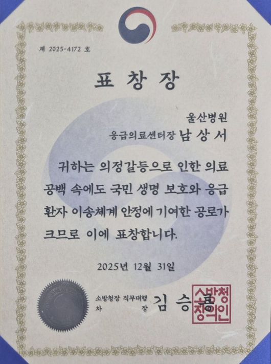 이번 표창은 국가적인 의료 위기 상황에서 국민의 생명을 보호하고, 응급환자 이송체계의 안정을 위해 헌신한 의료인에게 수여됐다.