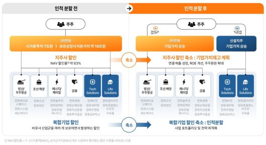 분할 비율은 순자산 장부가액을 기준으로 존속 법인 76.3%, 신설 법인 23.7%로 산정됐다. 기존 주주들은 존속 법인과 신설 법인 주식을 분할 비율대로 배정받게 된다. ㈜한화는 “존속 법인은 방산·조선 등 핵심 사업에 집중하고 주주환원을 강화함으로써 시장 재평가가 기대된다”며 “신설 법인은 독립적 지주 체계에서 분할 전 상대적으로 저평가됐던 사업의 성장성이 부각되고, 적기에 투자 의사 결정을 할 수 있게 돼 기업 가치가 올라갈 것”이라고 분할 배경을 설명했다.