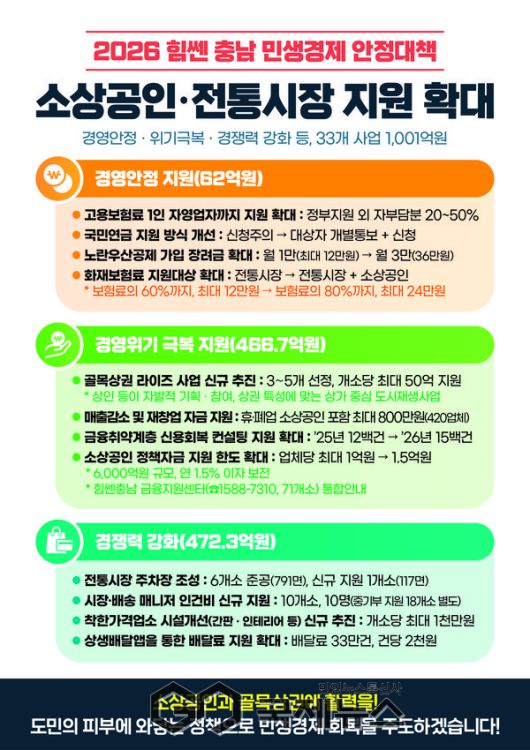 (충남=국제뉴스) 박의규 기자 = 충남도가 새해를 맞아 소상공인과 전통시장의 경영 안정을 돕고 골목상권에 활력을 불어넣고자 지원 정책을 확대한다.
