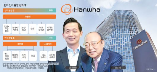 ㈜한화 이사회가 14일 방산, 조선·해양, 에너지, 금융 부문이 속하는 존속법인과 테크·라이프 부문이 포함된 신설법인(한화머시너리앤서비스홀딩스)으로 인적분할하는 안을 결의했다. 이에 테크 분야 계열사(한화비전·한화모멘텀·한화세미텍·한화로보틱스 등)와 라이프 분야 계열사(한화갤러리아·한화호텔앤드리조트·아워홈 등)는 한화머시너리앤서비스홀딩스에 들어가게 된다.