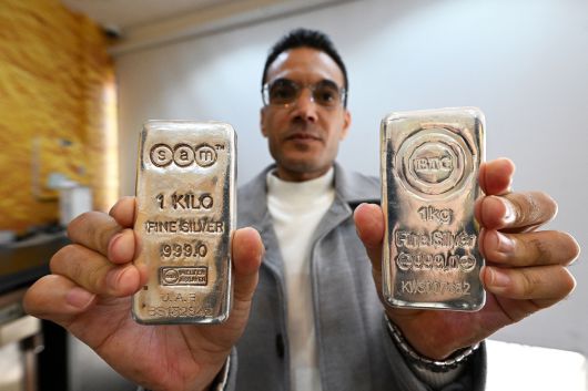 지난 12일(현지시간) 쿠웨이트 시내에 있는 한 보석상이 자신의 가게에서 은색 막대를 보여주고 있다. [AFP] |