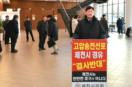 제천시의회 박영기 의장도 따로 1인 시위에 나섰다. 그는 동강시스타 로비에서 피켓을 들고 "제천은 송전선로 전력 공급과 직접 연관성이 없다"며 재검토를 촉구했다.