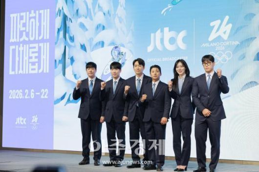 [사진=유대길 기자 dbeorlf123@ajunews.com] 배성재 아나운서(왼쪽부터)와 성승헌 캐스터, 이승훈, 곽윤기, 김아랑, 윤성빈 해설위원이 14일 오후 서울 영등포구 페어몬트 앰배서더 서울 그랜드볼룸에서 열린 JTBC '2026 밀라노 코르티나 동계올림픽' 기자간담회에 참석해 포즈를 취하고 있다. 2026.01.14 아주경제=유대길 기자 dbeorlf123@ajunews.com - Copyright ⓒ [아주경제 ajunews.com] 무단전재 배포금지 -