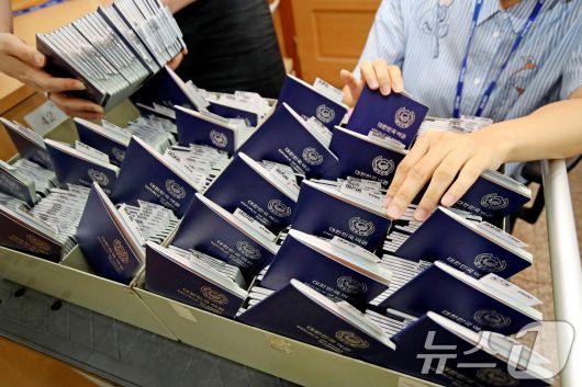 본격적인 휴가철을 앞두고 여권 발급 신청이 급증하고 있다. 15일 오전 대구 달서구청 민원실 여권 교부처에서 담당 직원이 신규 발급된 여권을 정리하고 있다. 2025.7.15/뉴스1 ⓒ News1 공정식 기자 |