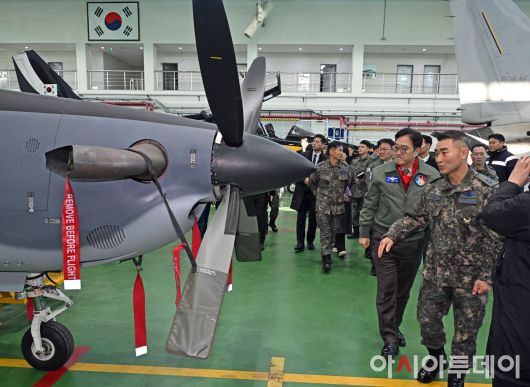 아시아투데이 송의주 기자 = 우원식 국회의장이 14일 강원도 원주시 제8전투비행단을 위문 방문해 공군 KA-1 공중통제공격기를 살펴보고 있다. ⓒ "젊은 파워, 모바일 넘버원 아시아투데이"