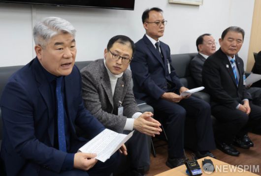 [서울=뉴스핌] 이길동 기자 = 김진향 한반도평화경제회의 의장(왼쪽)등 남북경협기관·단체장들이 14일 오후 서울 종로구 정부서울청사 통일부 기자실을 찾아 '남북경협 기관·단체 남북관계 신뢰회복-평화복원' 기자회견을 하고 있다.2026.01.14 gdlee@newspim.com