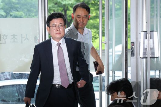 강의구 전 대통령실 부속실장이 16일 오후 서울 서초구 이명현 순직해병특검 사무실에 출석하고 있다. 2025.7.16/뉴스1 ⓒ News1 신웅수 기자 |