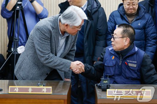 (서울=뉴스1) 안은나 기자 = 박점곤 서울시버스노동조합 위원장(오른쪽)과 김정환 서울시버스사업조합 이사장이 서울 시내버스 파업 이틀째인 14일 오후 영등포구 서울지방노동위원회에서 서울 시내버스 노사 협상에 앞서 악수하고 있다. 2026.1.14/뉴스1