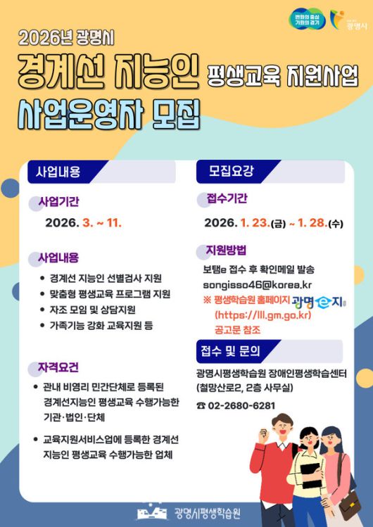 (광명=국제뉴스) 윤은중 기자 = 광명시는 '2026년 광명시 경계선지능인 평생교육 운영 지원사업'을 수행할 보조사업자를 오는 28일까지 공개 모집한다.