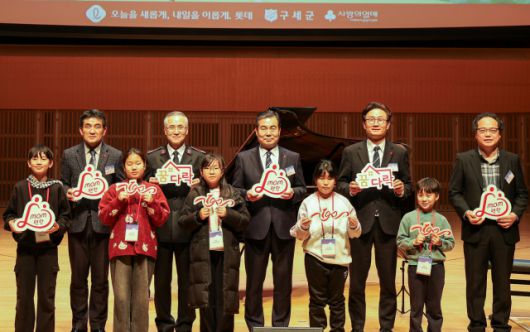14일 서울 송파구 롯데콘서트홀에서 열린 'mom편한 꿈다락 100호점 개관 기념식'에서 황인식(뒷줄 왼쪽부터) 사회복지공동모금회 사무총장과 김병윤 구세군 사령관, 임성복 롯데지주 커뮤니케이션실장, 신현성 국무총리실 민정실장, 임태근 보건복지부 사무관이 어린이들과 기념 촬영을 하고 있다. 'mom편한 꿈다락'은 롯데와 구세군이 함께 노후화된 지역아동센터를 리모델링하는 사업으로 지난해 12월 100호점을 개관했다. 사진 제공=롯데