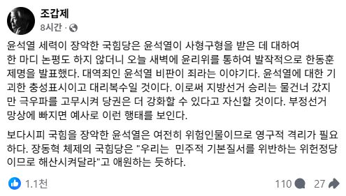 보수논객 조갑제 (조갑제닷컴) 대표 역시 페이스북을 통해 "윤 전 대통령 사형 구형에는 한 마디 논평도 안 하고, 윤리위를 통해 발작적으로 한동훈 제명을 발표했다"고 말했다. 이어 이를 "윤석열에 대한 기괴한 충성표시·대리복수" 라면서, "부정선거 망상상에 빠지면 예사로 이런 행태를 보인다"고 주장했다.