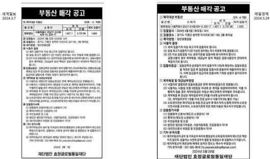 한국가정연합이 2024년 일간지와 경제지에 게재한 평화빌딩 부동산 매각 공고. |