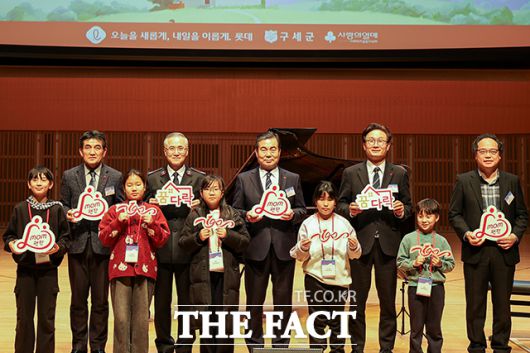 [더팩트 | 송호영 기자] 롯데가 14일 서울 송파구 롯데콘서트홀에서 개최한 'mom편한 꿈다락 100호점 개관 기념식'에서 황인식 사회복지공동모금회 사무총장과 김병윤 구세군 사령관, 임성복 롯데지주 커뮤니케이션실장, 신현성 국무총리실 민정실장,임태근 보건복지부 사무관(뒷줄 왼쪽부터) 등이 리본 세리머니를 진행하고 있다.
