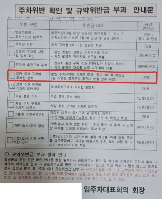 안내문에는 주차 위반 유형별로 위반금이 책정돼 있었다. 방문 차량증이나 주차 스티커를 부착하지 않을 경우 최초 1만원, 이후 2만원의 위반금이 부과된다. 주차 구획을 두 칸 이상 점유하면 5만원, 장애인 주차구역 위반이나 전기차 충전구역 주차 시에는 각각 10만원의 위반금이 부과된다.