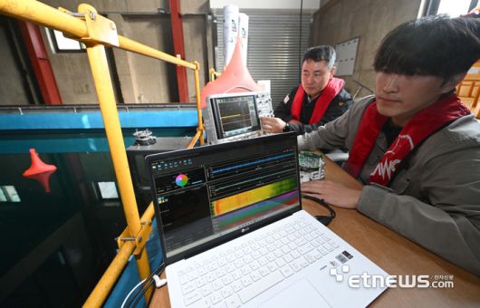 해운·조선·에너지 등 해양산업 전반에 디지털 전환이 빠르게 확산되는 가운데 해양IT 전문업계가 기술 고도화에 매진하고 있다. 14일 부산 남구 소나테크에서 연구원이 인공지능(AI) 기술을 활용해 음파탐지기술을 테스트하고 있다.