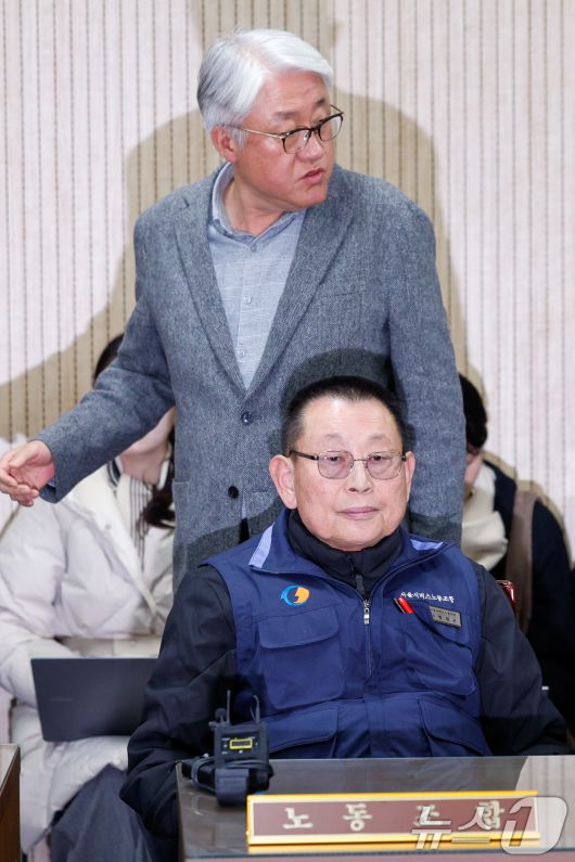 (서울=뉴스1) 안은나 기자 = 박점곤 서울시버스노동조합 위원장(앞줄)과 김정환 서울시버스사업조합 이사장이 서울 시내버스 파업 이틀째인 14일 오후 영등포구 서울지방노동위원회에서 열린 서울 시내버스 노사 협상 관련 제2차 사후 노동쟁의 조정회의에 참석하고 있다. 2026.1.14/뉴스1