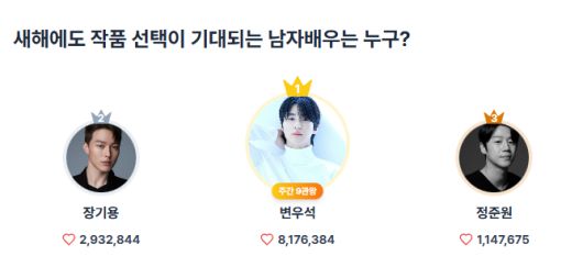 [스타데일리뉴스=서태양기자] 1월 1주차 스타트렌드 팬 투표 '영화·드라마 남자' 부문에서 배우 변우석이 총 8,176,384표를 기록하며 압도적인 1위에 올랐다.