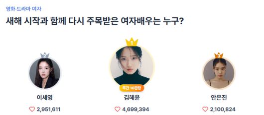 팬들의 반응은 열정 그 자체였다. "연기할 때 눈빛이 달라진다", "김혜윤 나오면 작품을 믿고 본다"는 코멘트가 이어지며, 이번 투표는 단순한 인기 경쟁을 넘어 연기에 대한 신뢰의 표현으로 읽힌다. 팬들은 그녀의 성장을 함께 지켜본 '목격자'이자 가장 단단한 지지자였다.