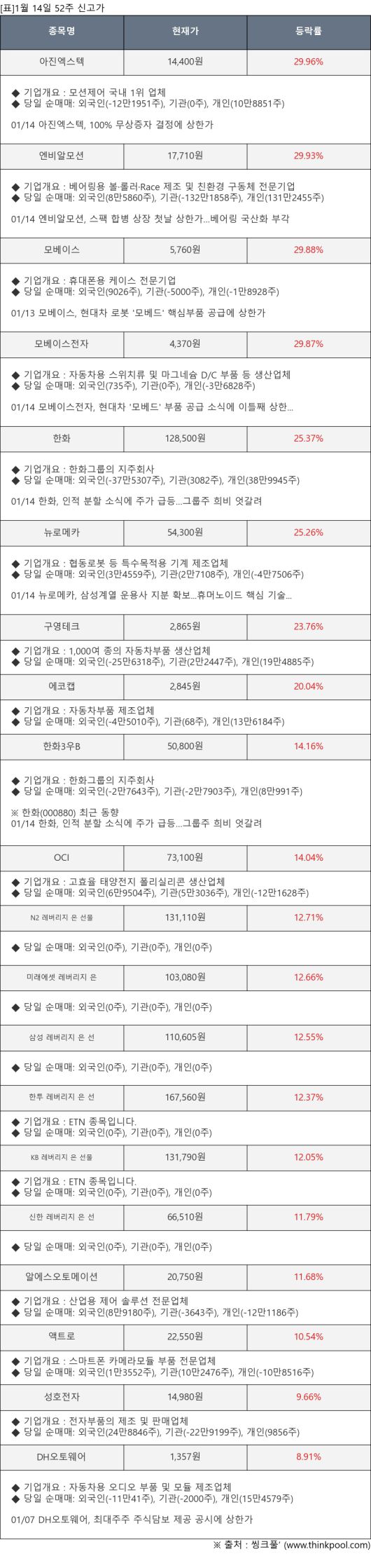 [서울=뉴스핌] 로보뉴스 = 1월 14일, 인공지능 투자비서 ‘AI라씨로’는 52주 신고가가 발생한 아진엑스텍(059120), 엔비알모션(0004V0) 등의 최근 동향을 분석해서 발표했다.
