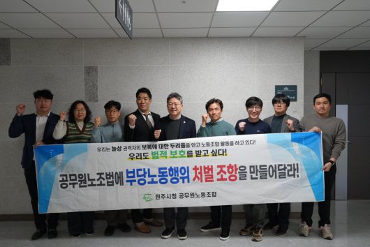 원주시청 공무원노동조합은 국민의힘 박정하(원주갑) 국회의원과 더불어민주당 정을호(비례) 국회의원을 연이어 방문, 공무원노조법에 부당노동행위 처벌 조항 삽입하는 안에 대한 입법 취지를 설명하고 국회차원의 도움을 요청했다고 14일 밝혔다.