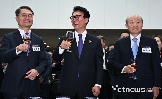 과학기술인·정보방송통신인 신년인사회가 14일 서을 강남구 과학기술회관에서 열렸다. 김민석 국무총리가 건배하고 있다. 왼쪽부터 김민수 한국과학기술단체총연합회 회장 직무대행, 김 총리, 노준형 한국정보방송통신대연합회장. 이동근기자 foto@etnews.com [Copyright © 전자신문. 무단전재-재배포금지]