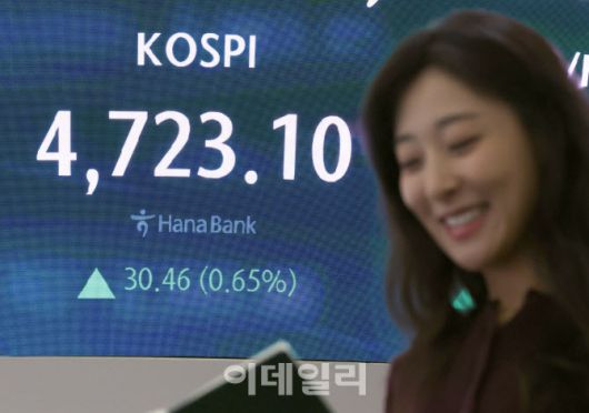 [이데일리 방인권 기자] 코스피가 사상 첫 4,700포인트를 돌파한 14일 서울 중구 하나은행 인피티니에서 딜러들이 업무를 보고 있다.