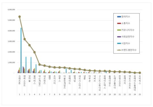 브랜드에 대한 평판은 브랜드에 대한 소비자들의 활동 빅데이터를 참여가치, 소통가치, 소셜가치, 시장가치, 재무가치로 구분해 분석한다. 게임 상장기업 브랜드평판지수는 참여지수, 소통지수, 커뮤니티지수, 사회공헌지수, 시장지수로 분석됐다.