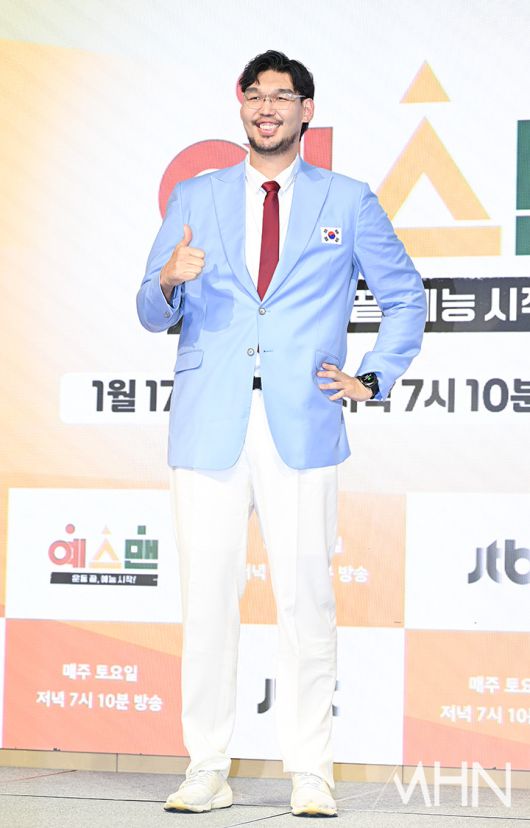 (MHN 이현지 기자) 하승진이 14일 오후 서울 영등포구 페어몬트 앰배서더 서울에서 진행된 JTBC의 신규 예능 '예스맨' 제작발표회에 참석해 포토타임을 갖고 있다.