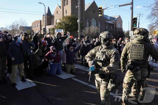 (미니애폴리스 로이터=뉴스1) 권영미 기자 = 13일(현지시간) 미국 미네소타주 미니애폴리스에서 경찰과 시민들이 대치하고 있다. 일부 시민은 항의의 뜻으로 무릎을 꿇고 있다. 2026.01.13. ⓒ 로이터=뉴스1 Copyright ⓒ 뉴스1. All rights reserved. 무단 전재 및 재배포, AI학습 이용 금지.