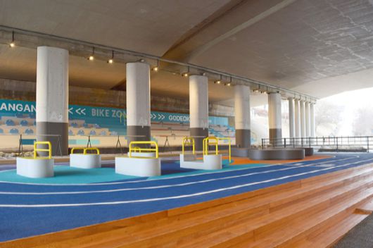 강동구가 올림픽대로 고덕천교 하부 유휴공간을 정비해 체류형 수변 문화공간인 '고덕천 라운지'를 조성했다. 사진은 고덕천 라운지의 모습. [사진=강동구] |
