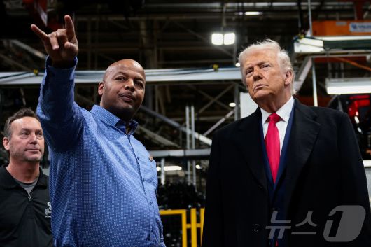 (디어본 로이터=뉴스1) 윤다정 기자 = 13일(현지시간) 도널드 트럼프 미국 대통령이 미국 미시간주 디어본에 위치한 포드 공장을 찾아 공장 관리자 코리 윌리엄스의 설명을 듣고 있다. 2026.01.13. ⓒ 로이터=뉴스1 Copyright ⓒ 뉴스1. All rights reserved. 무단 전재 및 재배포, AI학습 이용 금지.