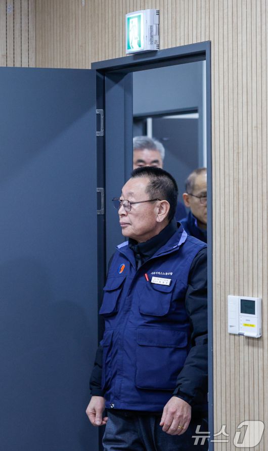 (서울=뉴스1) 안은나 기자 = 박점곤 서울시버스노동조합 위원장이 서울 시내버스 파업 이틀째인 14일 오후 영등포구 서울지방노동위원회에서 열린 서울 시내버스 노사 협상 관련 제2차 사후 노동쟁의 조정회의에 입장하고 있다. 2026.1.14/뉴스1coinlocker@news1.krCopyright ⓒ 뉴스1. All rights reserved. 무단 전재 및 재배포, AI학습 이용 금지.