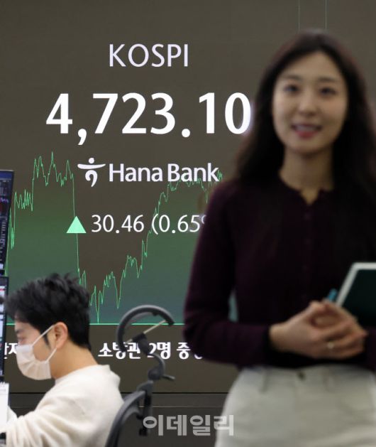[이데일리 방인권 기자] 코스피가 사상 첫 4,700포인트를 돌파한 14일 서울 중구 하나은행 인피티니에서 딜러들이 업무를 보고 있다.