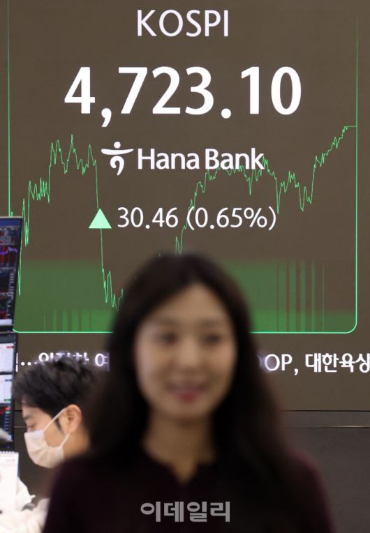 [이데일리 방인권 기자] 코스피가 사상 첫 4,700포인트를 돌파한 14일 서울 중구 하나은행 인피티니에서 딜러들이 업무를 보고 있다.