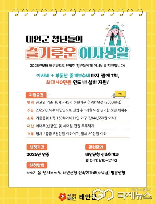 (태안=국제뉴스) 최병민 기자 = 충남 태안군이 청년들의 초기 주거 부담을 낮춰 인구 유입을 활성화하고자 '2026년 청년 이사비 지원사업'을 추진하며 청년인구 사수에 나선다.