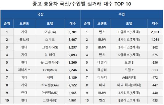 국산 승용차 시장에서는 기아 모닝이 3781대로 1위를 기록했고, 쉐보레 스파크(3407대), 현대 그랜저(3237대)가 뒤를 이었다. 경차와 중대형 세단이 동시에 상위권을 차지하며 '유지비 절감'과 '차급 만족도'를 함께 고려하는 소비 심리가 이어졌다.