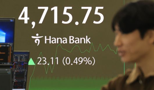 14일 서울 중구 하나은행 본점 딜링룸에서 직원이 증시와 환율을 모니터링하고 있다. 코스피는 7.53p(0.16%) 내린 4685.11로 개장해 상승전환, 장중 사상 첫 4700선을 돌파했다. |