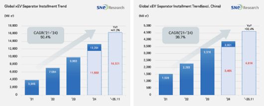 SNE리서치는 "분리막 시장의 경쟁력은 생산량보다 기술 완성도와 공급 안정성, 지역별 대응 역량에 의해 좌우되는 구조로 변하고 있다"며 "비(非)중국 업체들은 범용 제품 경쟁을 피하고 코팅, 초박막, 고내열 등 고부가 중심의 프리미엄 포지션을 강화하는 동시에 북미·유럽에서는 현지 후공정 내재화와 장기 계약을 통해 안정적 물량을 확보하는 방향이 유효하다"고 분석했다.
