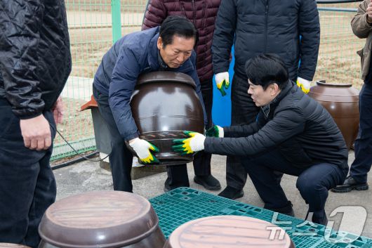 정청래 더불어민주당 대표가 14일 충남 당진시 백석올미마을기업을 방문해 장독 옮기기 작업을 하고 있다. 2026.1.14/뉴스1 ⓒ News1 유승관 기자 |