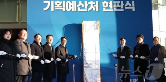 김민석 국무총리가 2일 오전 세종시 정부세종청사 6동에서 열린 기획예산처 개청 현판식에 참석해 부처 관계자들과 현판 제막을 하고 있다. 2026.1.2/뉴스1 ⓒ News1 김기남 기자 |