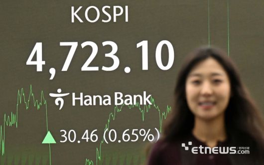코스피가 4700선을 넘어서며 사상 최고치를 경신했다. 14일 코스피는 전일대비 30.46(0.65%) 오른 4723.10으로 장을 마감했다. 이날 서울 중구 하나은행 본점 딜링룸에 코스피 지수가 표시돼 있다.