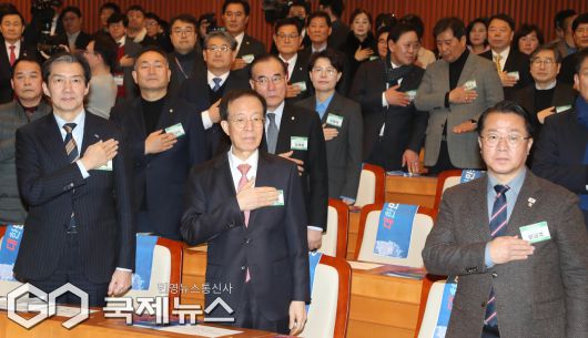 (서울=국제뉴스) 이석연 대통령 직속 국민통합위원장과 조국 조국혁신당 대표가 14일 오후 서울 여의도 국회 박물관에서 열린 '2026 국가균형발전 선도 영·호남 공동선포식 및 신년교류회'에서 국민의례하고 있다./사진=이용우 기자